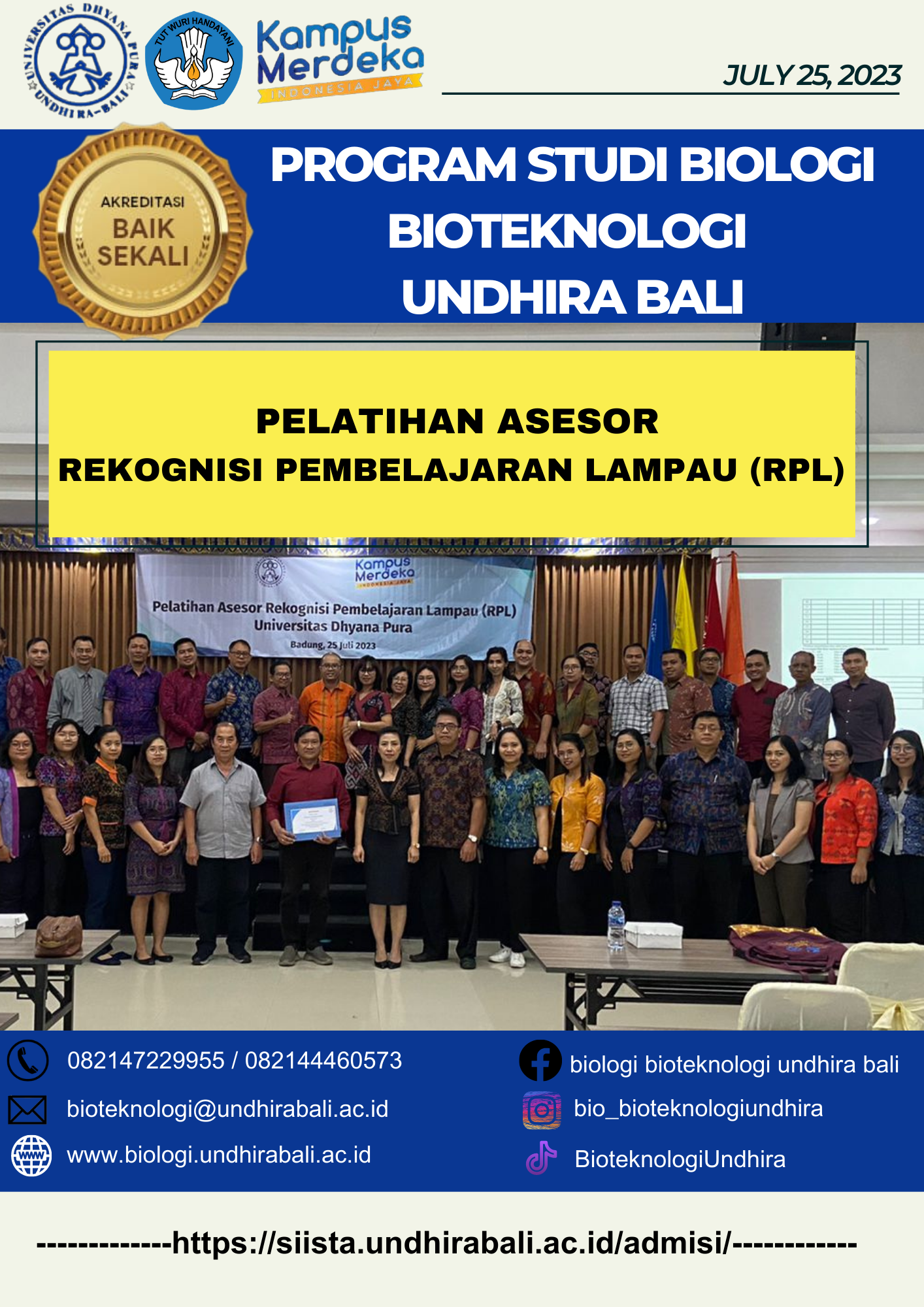 Beberapa Dosen Program Studi Biologi Bioteknologi Universitas Dhyana Pura telah ditunjuk untuk mengikuti Pelatihan Asesor RPL (Rekognisi Pembelajaran Lampau) yang diselenggarakan oleh Bagian Pengembangan Metodologi Pembelajaran dan MKU. RPL merupakan proses pengakuan atas Capaian Pembelajaran (CP) seseorang yang diperoleh dari pendidikan formal, nonformal, informal, dan/atau pengalaman kerja sebagai dasar untuk melanjutkan pendidikan formal dan untuk melakukan penyetaraan dengan kualifikasi tertentu. Acara ini telah terselenggara pada Selasa, 25 Juli 2023 di Aula E Universitas Dhyana Pura. Tujuan diselenggarakannya kegiatan ini untuk perluasan akses pendidikan tinggi dan peningkatan relevansi serta kualitas pembelajaran dan kompetensi lulusan. Dengan adanya penyetaraan hasil belajar formal, nonformal, informal, dan/atau pengalaman kerja tersebut maka masyarakat menjadi lebih terbuka untuk belajar sepanjang hayat.
