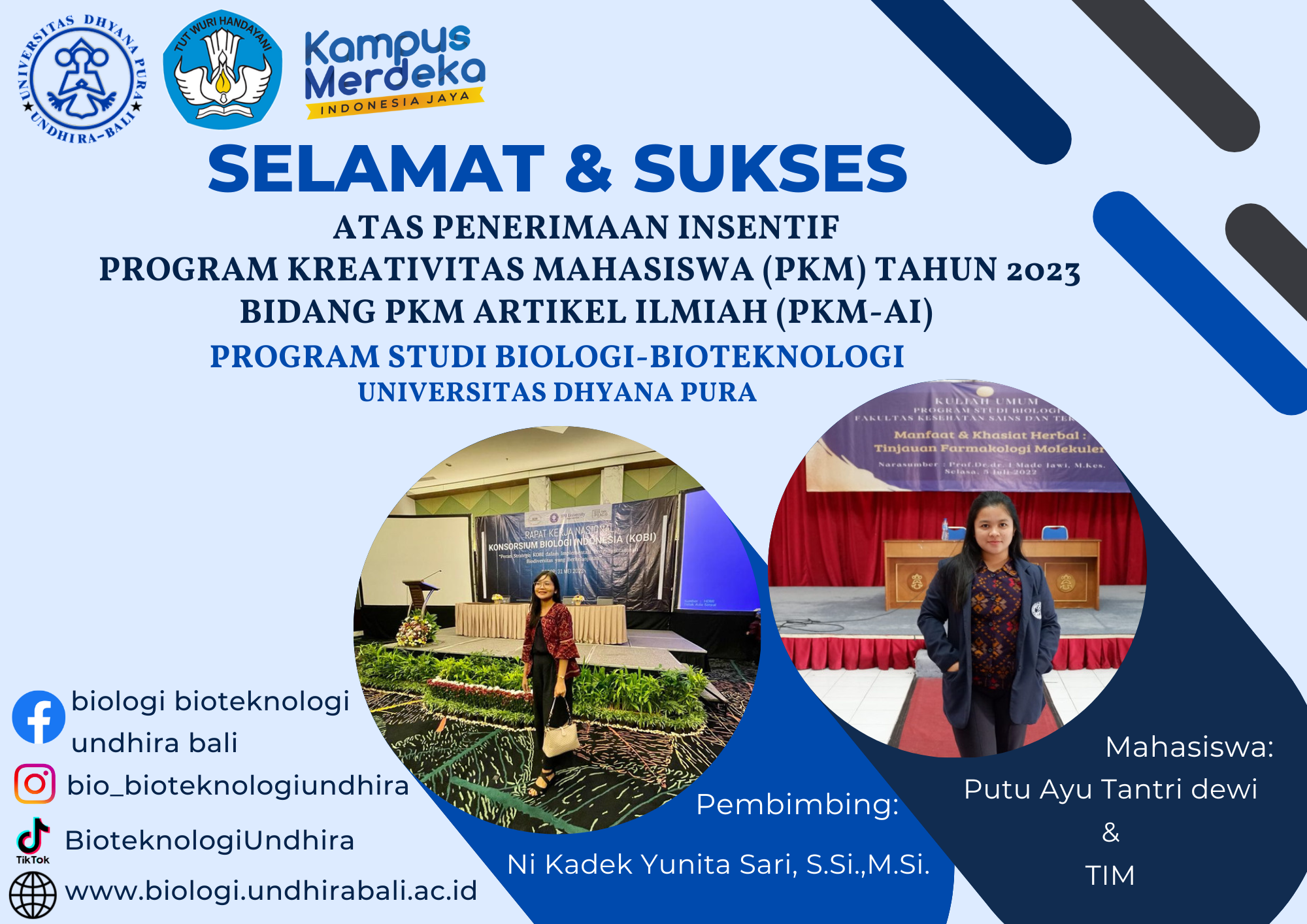 Menjadi suatu kebangggan, salah satu Mahasiswa Program Studi Biologi Bioteknologi Undhira Bali atas nama: Putu Ayu Tantri Dewi & TIM berhasil menerima insentif PKM-AI Tahun 2023