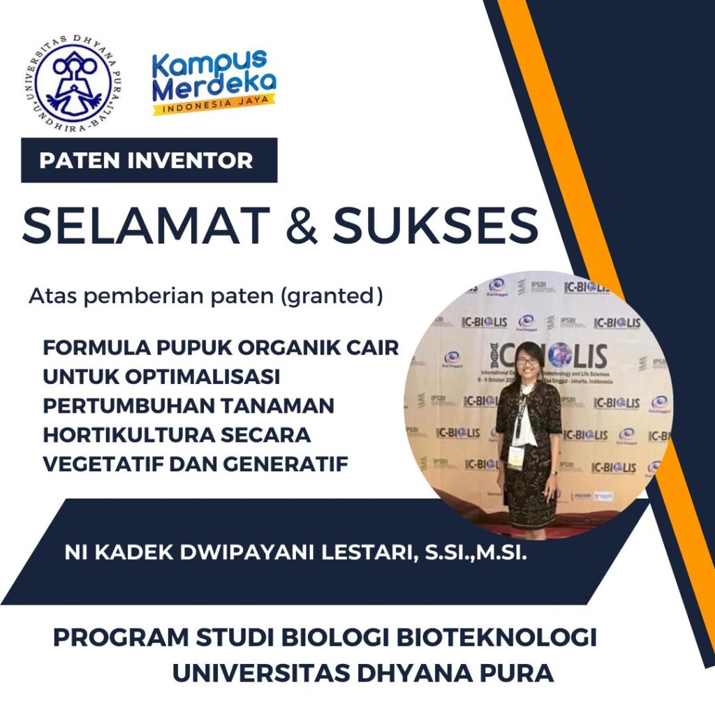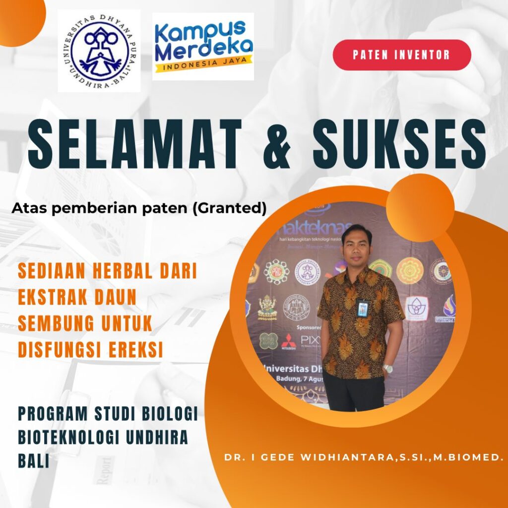 Menjadi suatu kebanggan bagi kami bahwa Dosen Program Studi Biologi: Bapak Dr. I Gede Widhiantara, S.Si., M.Biomed dengan karya Sediaan Herbal Dari Ekstrak Daun Sembung Untuk Disfungsi Ereksi dan Ibu Ni Kadek Dwipayani Lestari, S.Si., M.Si beserta TIM dengan karya Formula Pupuk Organik Cair Untuk Optimalisasi Pertumbuhan Tanaman Hortikultura Secara Vegetatif dan Generatif berhasil menerima paten (Granted).